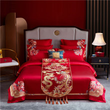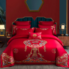 高端 160支双股长绒棉绣花大红结婚四件套全棉贡缎绣花婚庆十件套